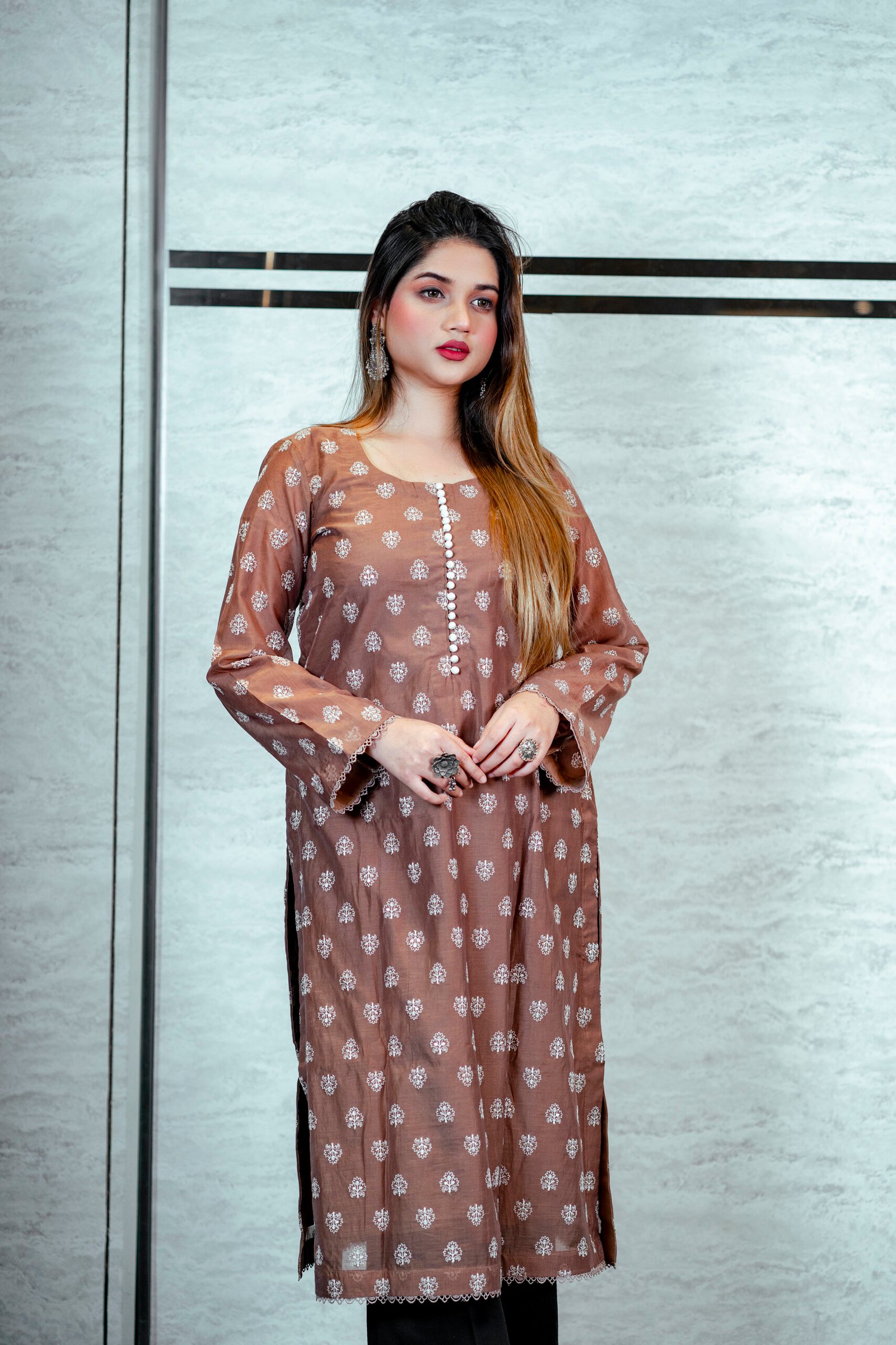 Diwan-E-Naz is a tribute to timeless craftsmanship and quiet opulence. Crafted from authentic Lucknow chikankari fabric, each motif reflects generations of artisanal mastery, delicately brought to life through intricate handwork. Veloria’s signature luxury lace frames the silhouette with effortless grace, adding a refined finish that speaks of heritage reimagined for the modern woman. Soft in presence yet powerful in elegance, Zehra is designed for moments where tradition, luxury, and individuality meet.