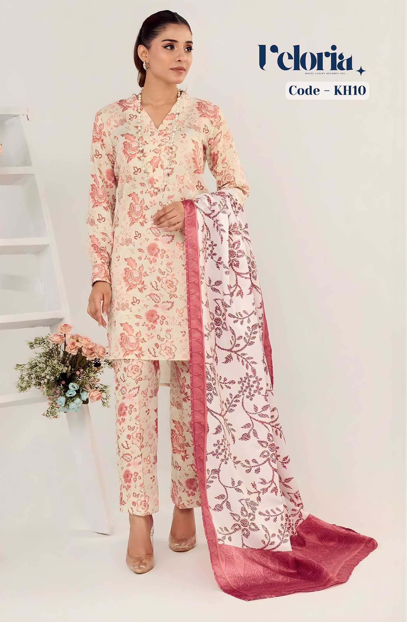 Gul-e-Zarafshan is a soft and graceful Pakistani ensemble in ivory tones, adorned with delicate rose prints and paired with a blush pink dupatta — a timeless symbol of elegance and femininity.