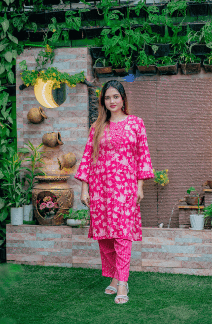 Gulbahar is a cheerful Pakistani ensemble in rosy pink, patterned with intricate motifs and paired with a playful polka-dotted dupatta — a blend of youthful charm and refined tradition.