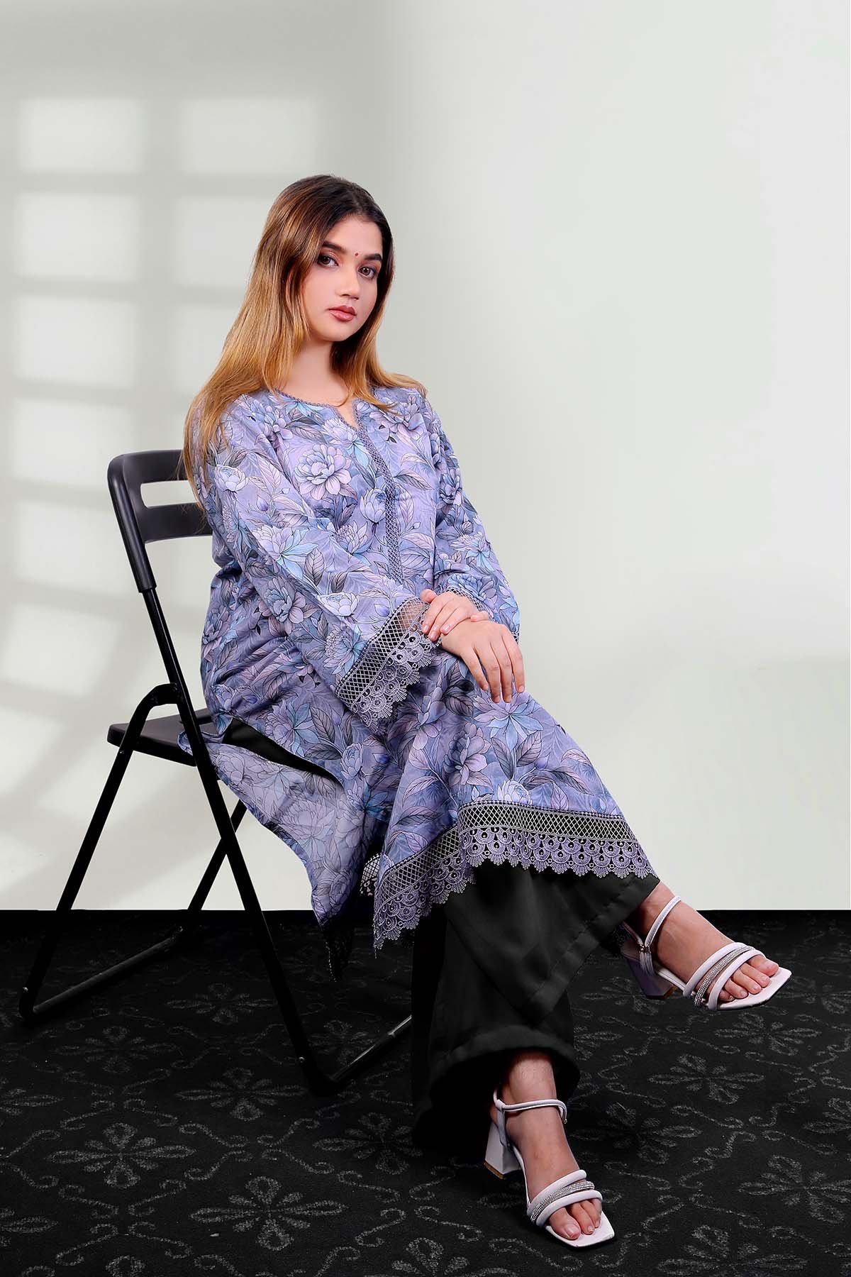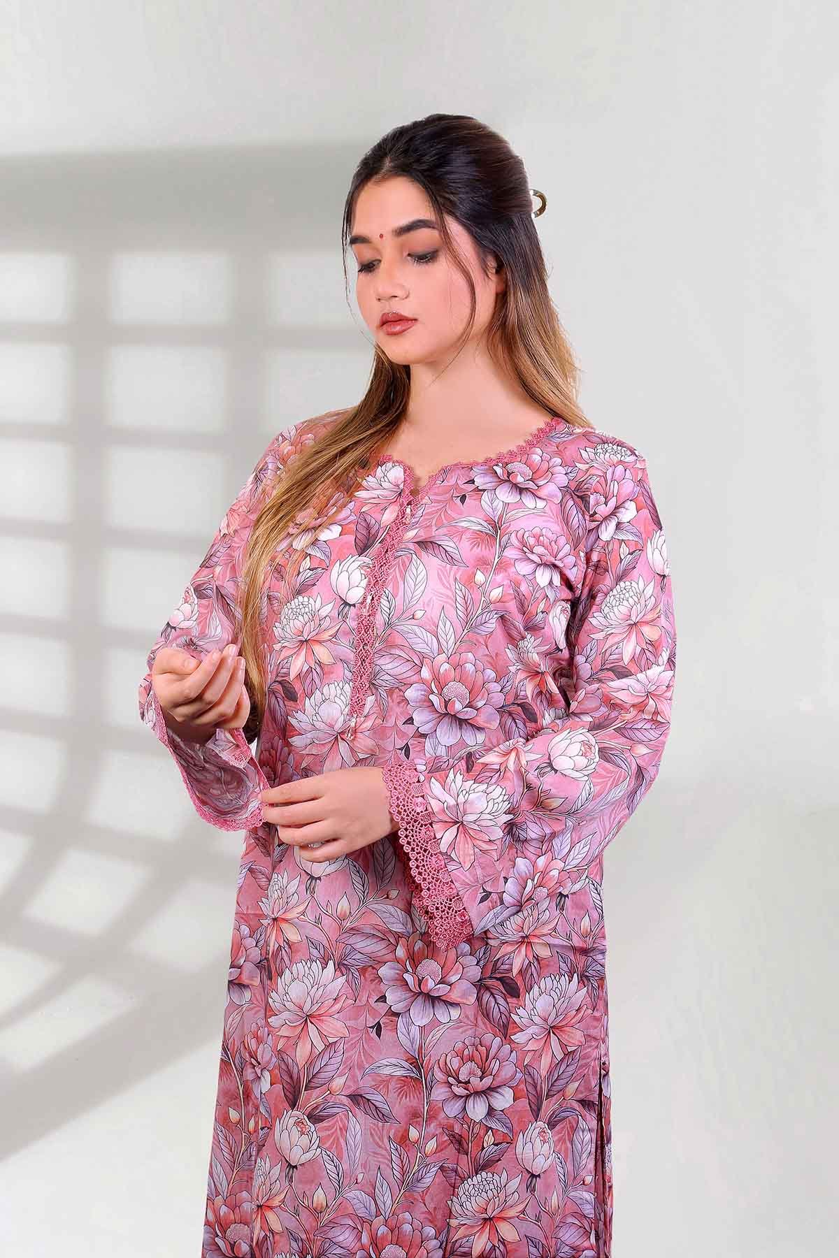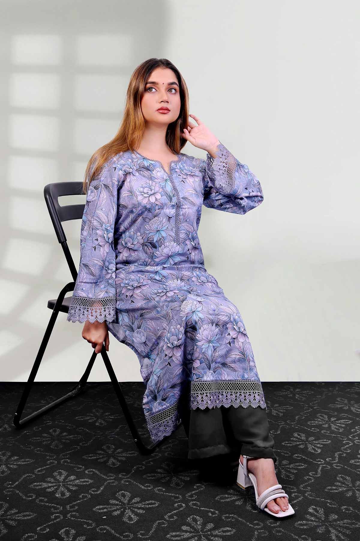 Gulraiz captures soft floral elegance with soothing pastel hues and delicate lace finishes. Graceful yet effortless, this design reflects refined Pakistani charm—perfect for serene daytime wear or understated gatherings.