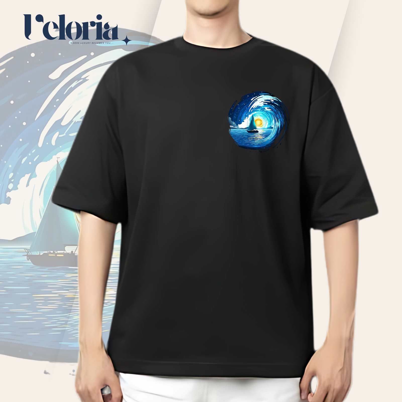 A calming escape in wearable form. The serene print of a boat sailing through a moonlit wave offers a moment of peace in motion. Every piece is handpicked and polished for an ultra-smooth feel that elevates your daily fit.